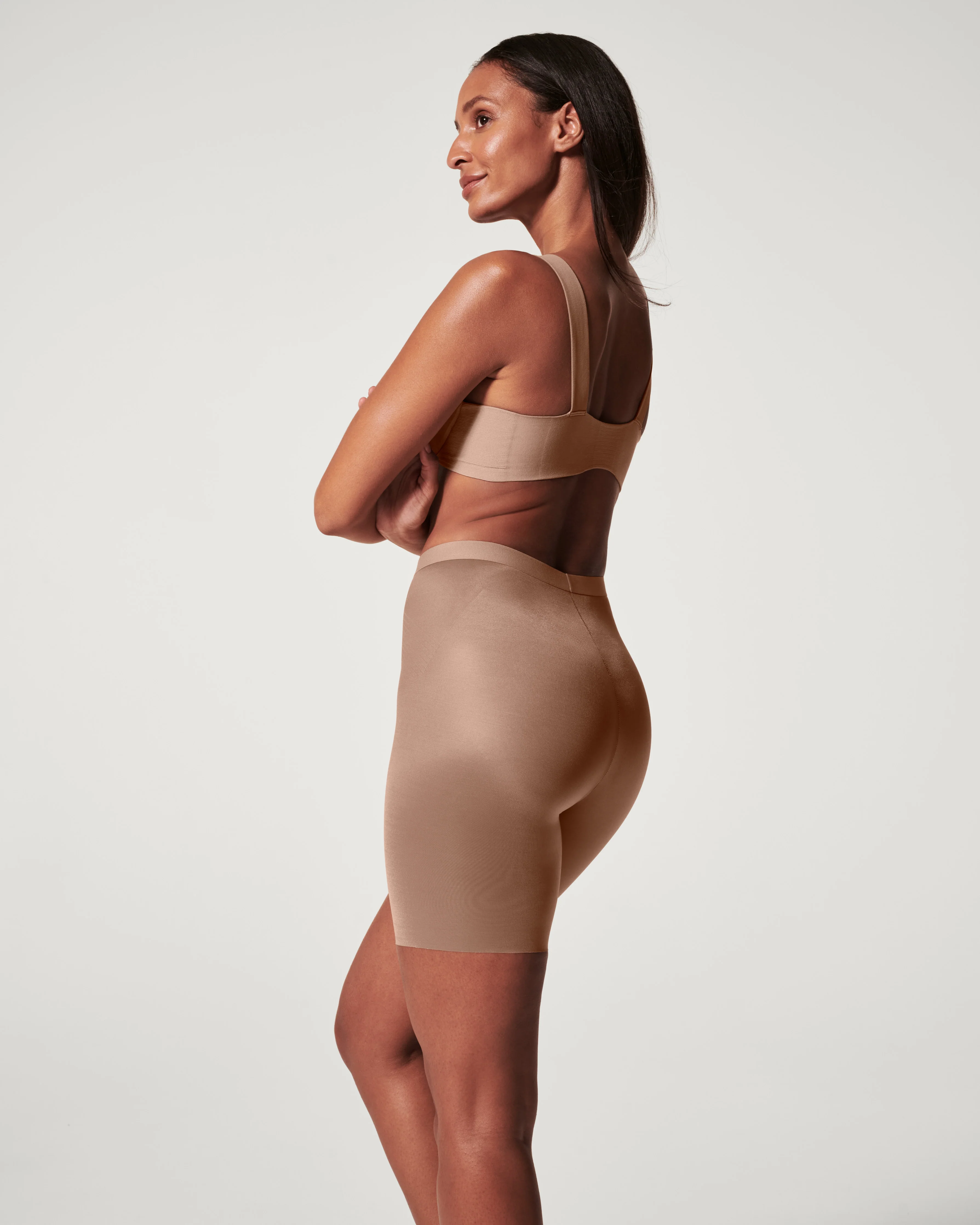 Experience lightweight and powerful compression with our SPANXshape™ Invisible Mid-Thigh Short. Featuring advanced single-layer Printed Power® shaping technology made with LYCRA FitSense® print technology, this high-waisted brief includes targeted tummy control panels that wrap around for 360-degree shaping. Designed with ultra-thin, breathable fabric that is moisture-wicking and quick-drying, a cotton gusset for comfort, a no-slip, no-squeeze silicone waistband that prevents rolling, and no-dig flexible leg openings, this shapewear prevents thigh-chafing and goes undetected under any outfit.