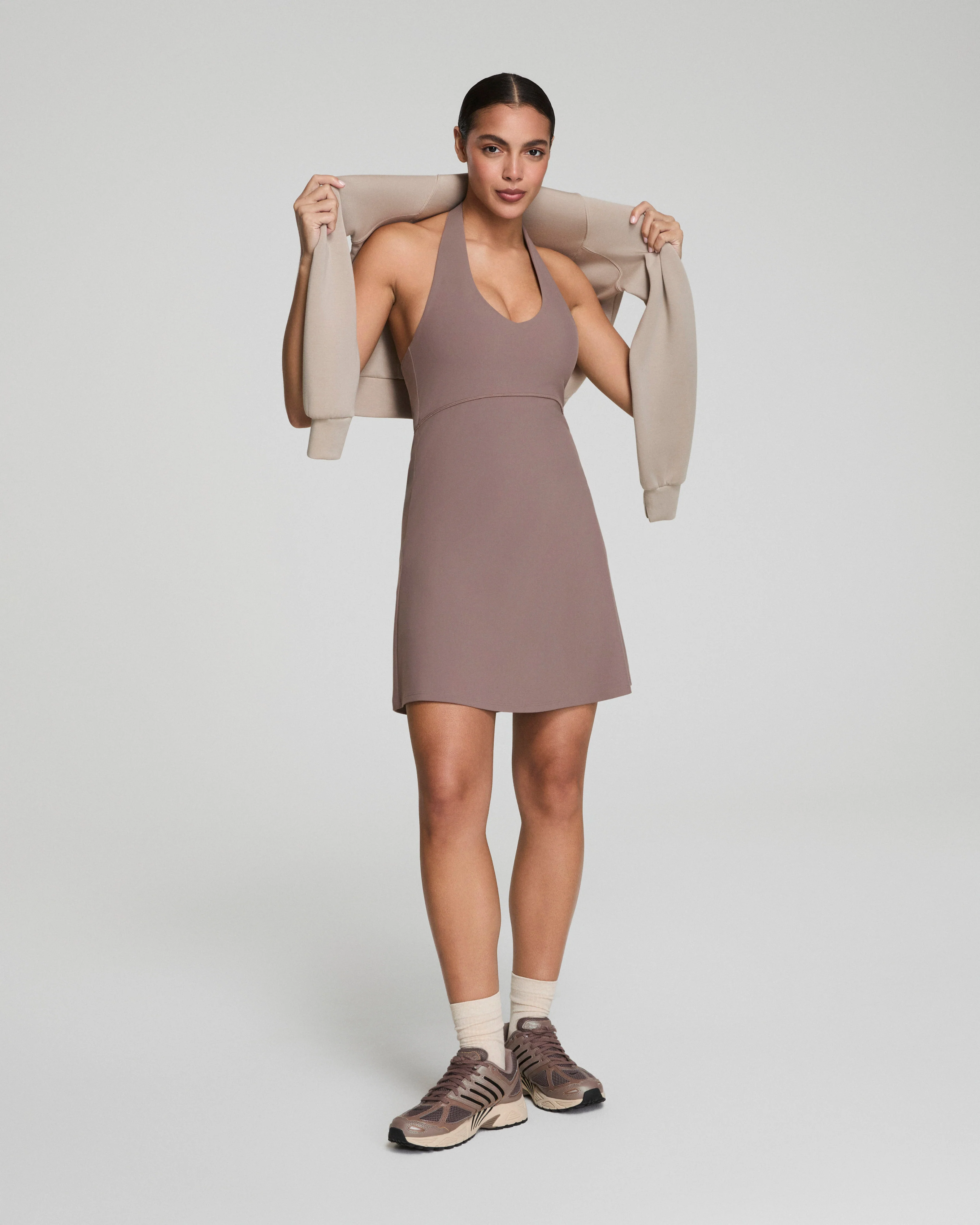 Our SPANXsmooth™ OnForm Halter Dress is made from buttery-soft, lightweight performance fabric with gentle smoothing built in. Breathable, sweat-wicking, and crafted with 4-way stretch, this halter dress features a shelf bra with removable cups for customizable support, hidden shorts with convenient side pockets, and our patent-pending Take Off Technology that makes bathroom breaks easy and fuss-free. This activewear essential is your go-to for before, during, and after your low-intensity workouts like Pilates or yoga.